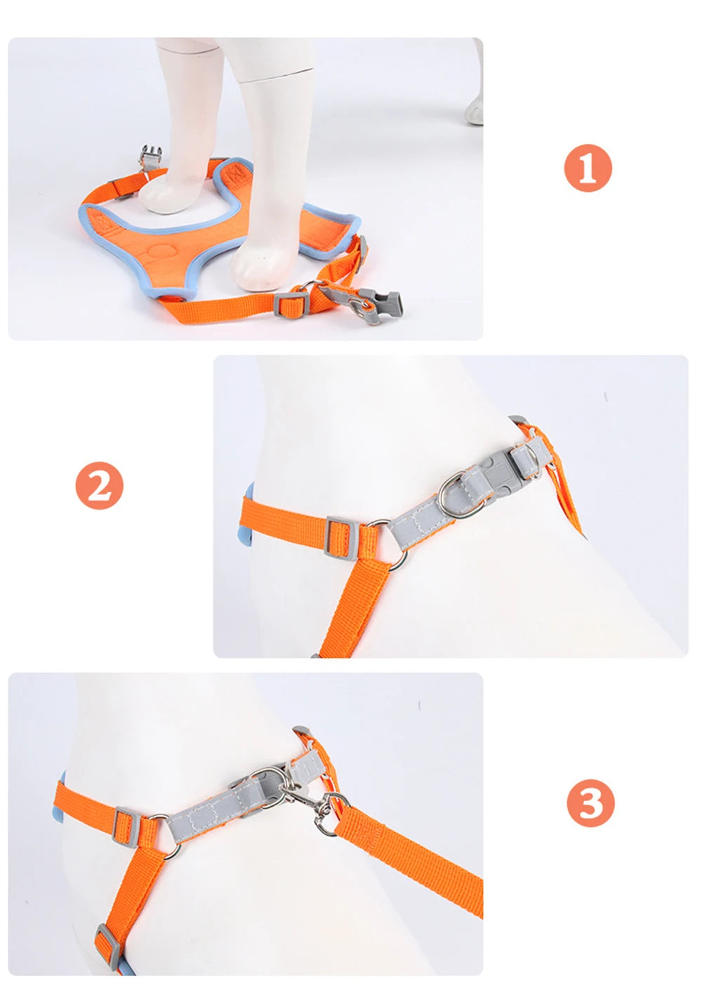 Simply slide the harness over your dog’s head, buckle it up, and adjust the straps. Made from durable nylon, the soft padding and breathable mesh keep your dog cool and comfortable, reducing the risk of injury while walking. -